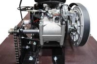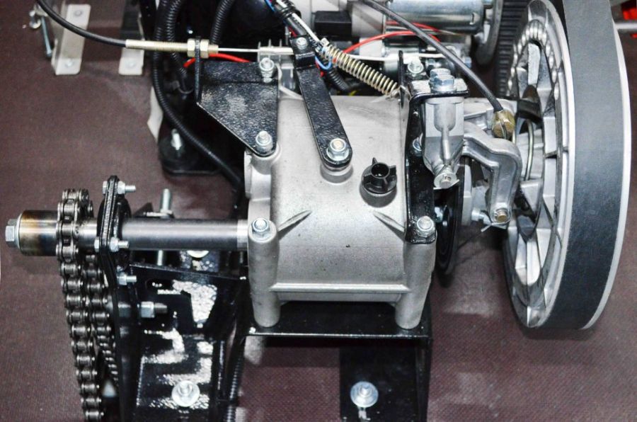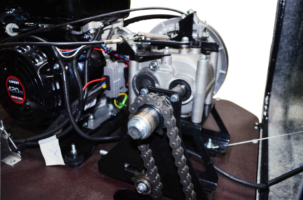Мотособака оснащена 4 тактным мотором мощностью 15 лошадиных сил, что позволяет набирать скорость до 40 км/ч. Это максимальная скорость, которая позволит владельцу быстро перевезти груз 500 кг. Мотобуксировщик отличается экономным расходом топлива - потребляет всего 3 л бензина в час. Объем двигателя достигает 460 кубов, что значительно сказывается на мощности и производительности мотобукса.