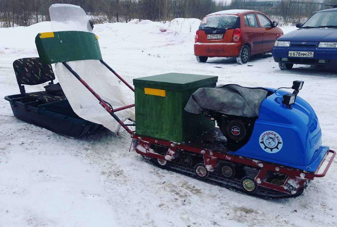 На мотобуксировщике Мотодог установлен четырехтактный двигатель и передний привод, что обеспечивает надежную тягу. Конструкция включает в себя также устойчивую раму и место для размещения груза, оснащен рулевым управлением для удобства маневрирования.