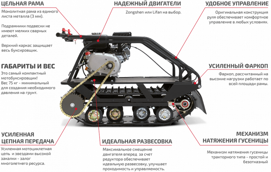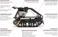Мотобукс весит 80 кг, а размеры его составляют 100 см в длину, 43 см в ширину и 70 см в высоту. Модель оснащена гусеницей шириной 380 мм. Гусеница в сочетании с катковой подвеской способна проходить спокойно по льду и даже по территории без снега.