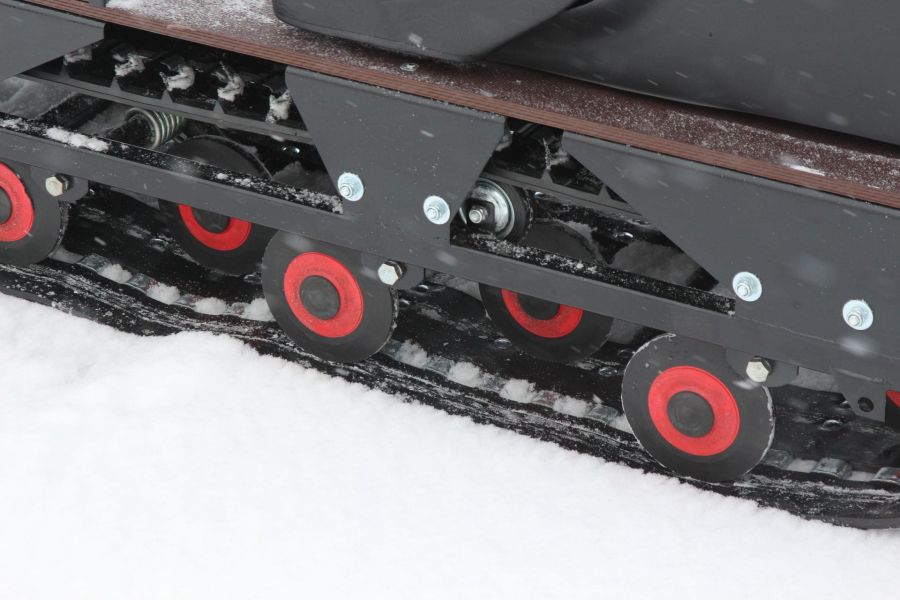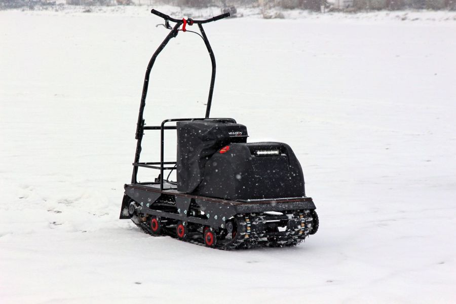 Мотособака весит 95 кг, а размер ее составляет 141 см в длину, 60 см в ширину и 70 см в высоту. Благодаря своей легкости и компактности, мотобуксировщик может маневрировать и проходить по рыхлой и мягкой почве. Кроме того, у мотобукса есть катковая подвеска, которая улучшает ход, обеспечивает устойчивость на неровной поверхности, а также смягчает удары и вибрации от дороги.
