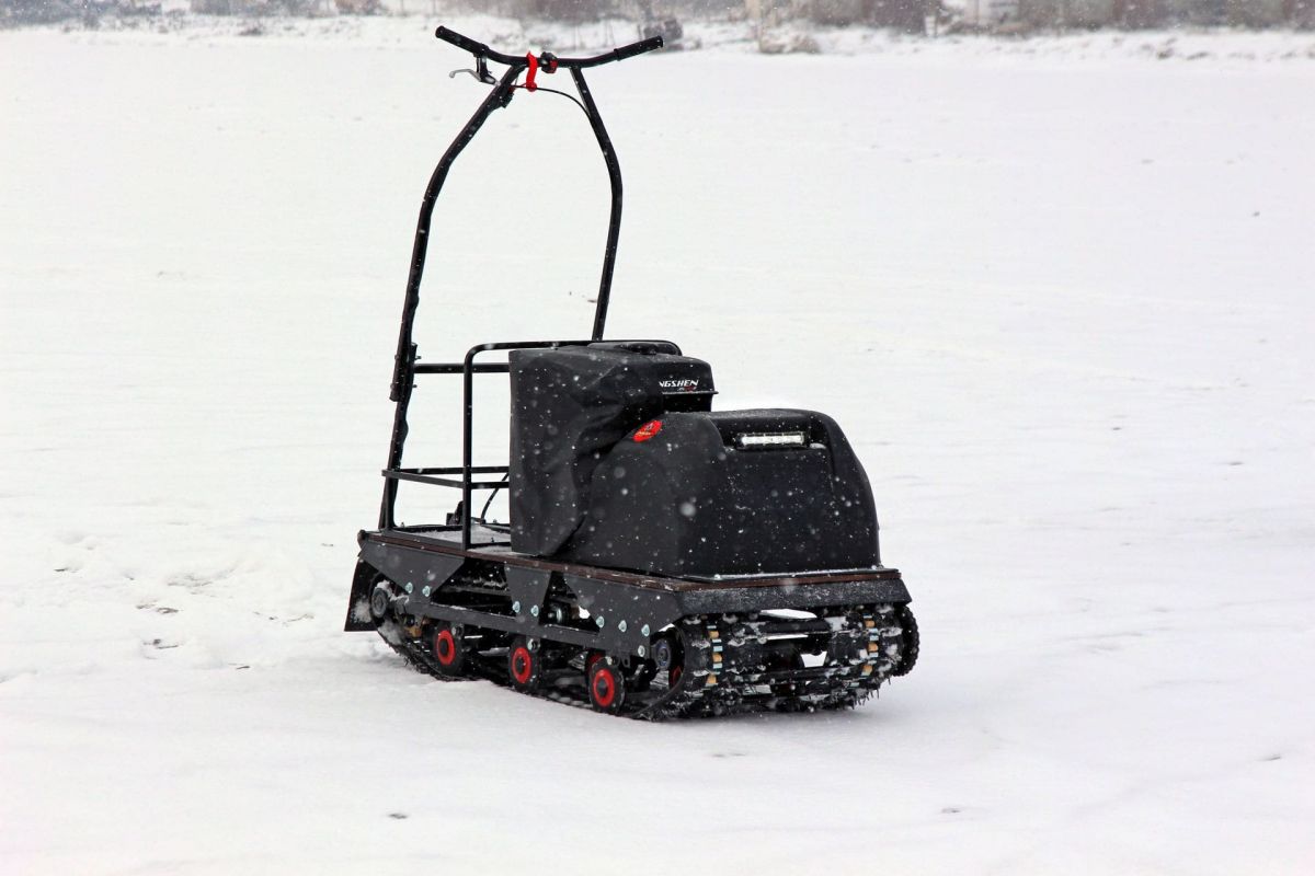 Этот мотобукс оснащен 4-х тактным двигателем мощностью 15 л. с., что позволяет достигать скорости до 45 км/ч. Это позволяет быстро перевозить груз весом до 40 кг, а также дополнительно до 200 кг в санях. Объем двигателя составляет 420 кубов, а топливный бак имеет объем 5,5 литров.